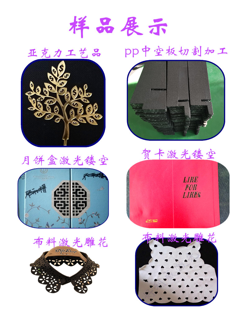 本公司專(zhuān)業(yè)對(duì)外加工布料切割加工、無(wú)紡布毛氈激光鏤空 皮革激光加工、服裝布料激光雕花、麂皮絨激光切割、亞克力,竹木盒月餅盒激光加工,皮革激光雕花等。激光沖孔切割不發(fā)黑不發(fā)黃不發(fā)臭無(wú)黑灰”受到眾多客戶認(rèn)可歡迎打樣咨詢(xún)。